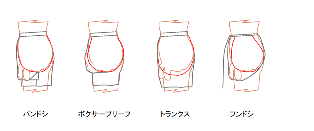 ここでは解説動画で「パンドシ」の詳細についてはご理解いただいているという前提で、「パンドシ」と他の男性用下着とで外性器の収納状態がどのように異なるのか比較します。